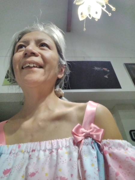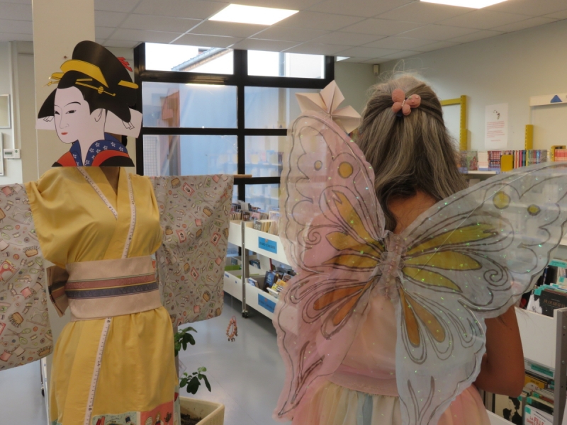 -Depuis enfant, je fais de la couture, principalement des vêtements pour moi. Il y a très longtemps, ma grand-mère m’a offerte sa machine à coudre. Dans mon exposition « Comme par magie » à la médiathèque de Viry-Châtillon, vous pouvez voir une kimono japonais sur le thème « j’aime la couture » et une robe salopette aux motifs de journaux chinois et japonais.