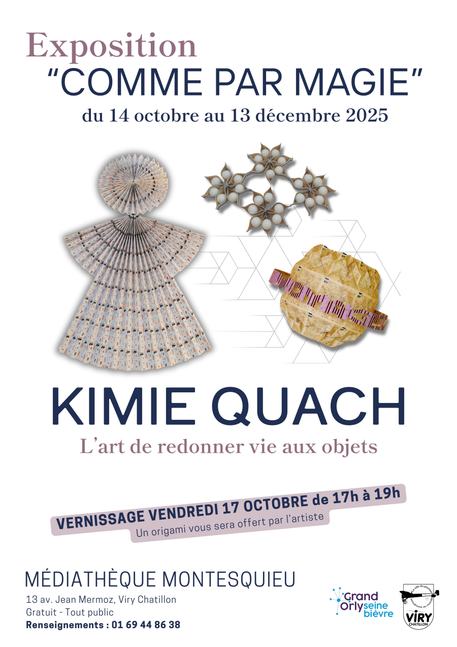 Je vais exposer à la Médiathèque Montesquieu à Viry-Châtillon du 14 octobre au 13 décembre. L’expo s’appelle Comme par magie car avec ma baguettte magique je transforme les choses insignifiantes en oeuvre d’art !